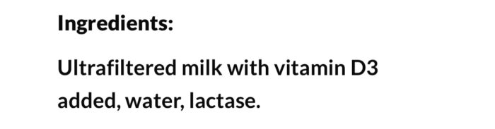 Ingredients: Ultrafiltered milk with vitamin D3 added, water, lactase.