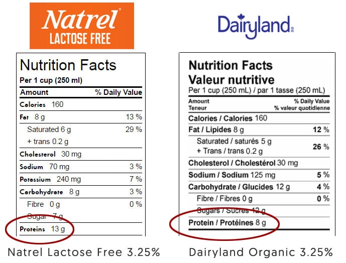 When comparing the Natrel lactose free 3.25% to the regular lactose-containing whole milk, in addition to less sugar (and hence less net carb), we noticed that the Natrel product also contained more protein per serving! This is good news for anyone looking to add more protein into your diet.